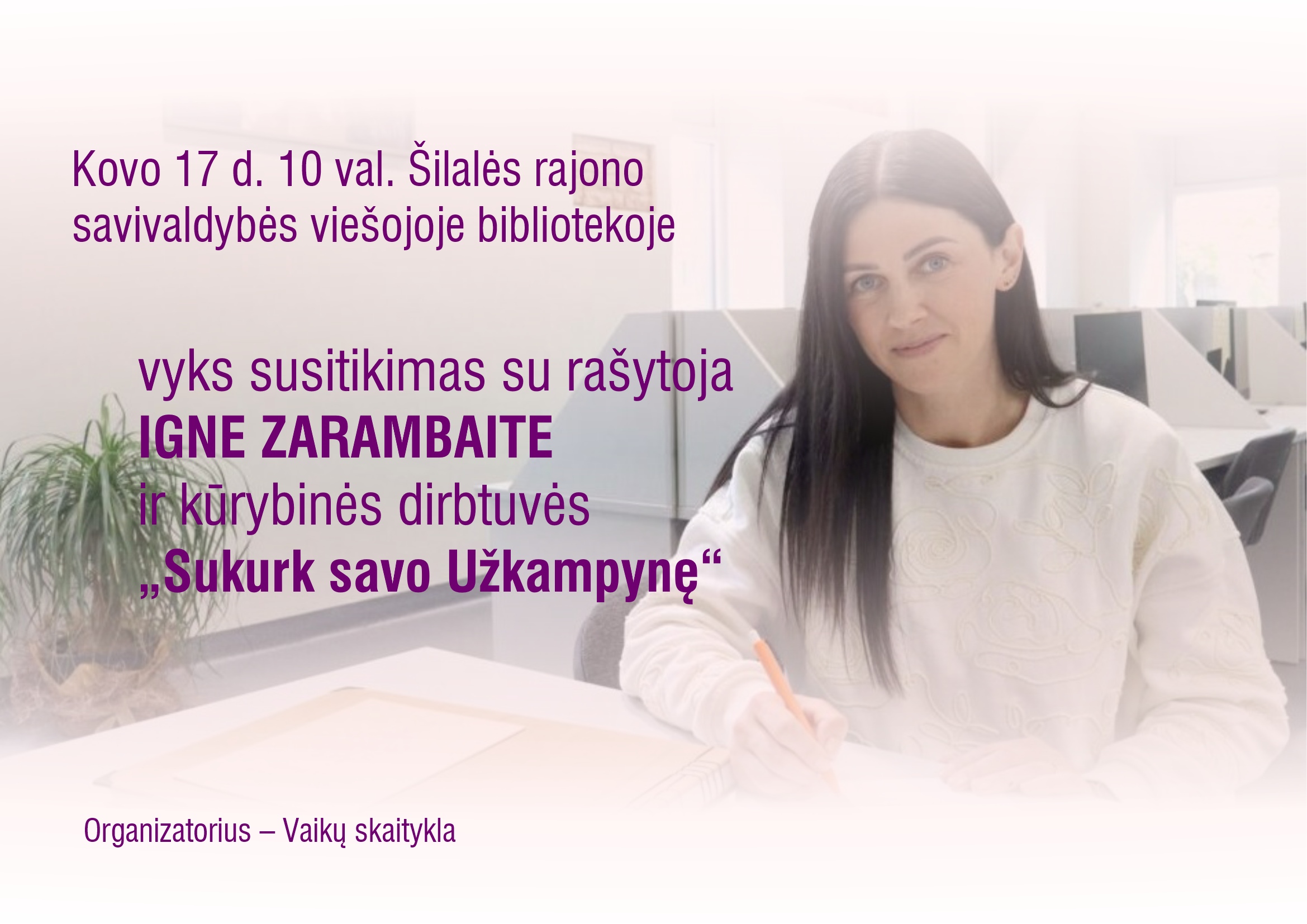 Kovo 17 d. 10 val. Šilalės rajono savivaldybės viešojoje bibliotekoje vyks susitikimas su rašytoja IGNE ZARAMBAITE ir kūrybinės dirbtuvės „Sukurk savo Užkampynę“.