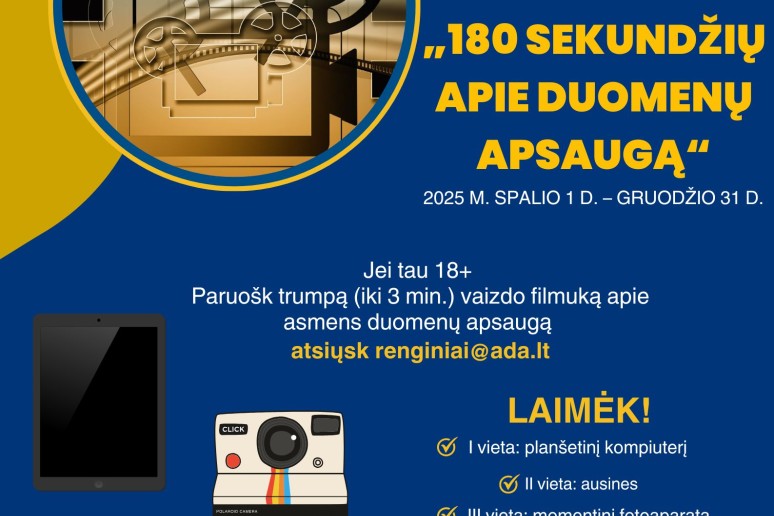 Jei esi kūrybingas, domiesi ar gilini žinias asmens duomenų ir (ar) privatumo apsaugos klausimais, jai tau nesvetima duomenų saugumo užtikrinimo problematika, esi tas, kuriam svarbios fizinio asmens, kaip duomenų subjekto, teisės, ir šiaip turi idėjų, kuriomis nori pasidalinti, tuomet šis konkursas tau. Nepraleisk progos. Pirmos trys prizinės vietos bus apdovanotos.