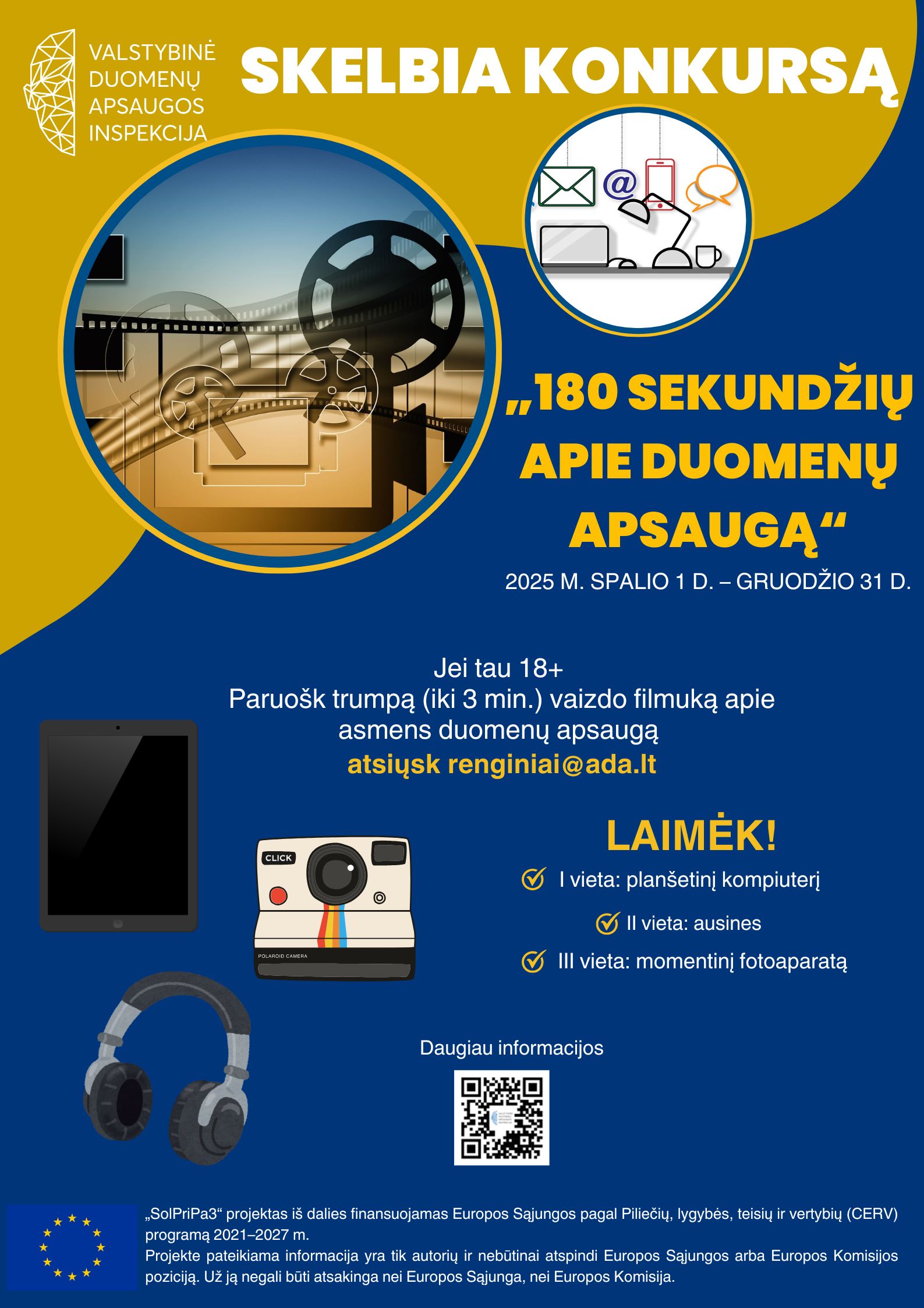 Valstybinė duomenų apsaugos inspekcija įgyvendina projektą SolPriPa 3: Žinok savo teises ir pareigas. SolPriPa (sprendžiant privatumo paradoksą, angl. solving privacy paradox) SolPriPa 3 projektas iš dalies finansuojamas Europos Sąjungos pagal Piliečių, lygybės, teisių ir vertybių (CERV) programą 2021–2027 m. Projekte pateikiame informacija yra tik autorių ir nebūtinai atspinti Europos sąjungos arba Europos Komisijos poziciją. Už ją negali būti atsakinga nei Europos Sąjunga, nei Europos Komisija.