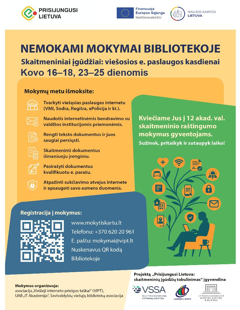Mokymai skirti Lietuvos gyventojams, kurie neturi pakankamai skaitmeninių įgūdžių arba nori juos sustiprinti. Į mokymus kviečiame visus asmenis nuo 18 m.