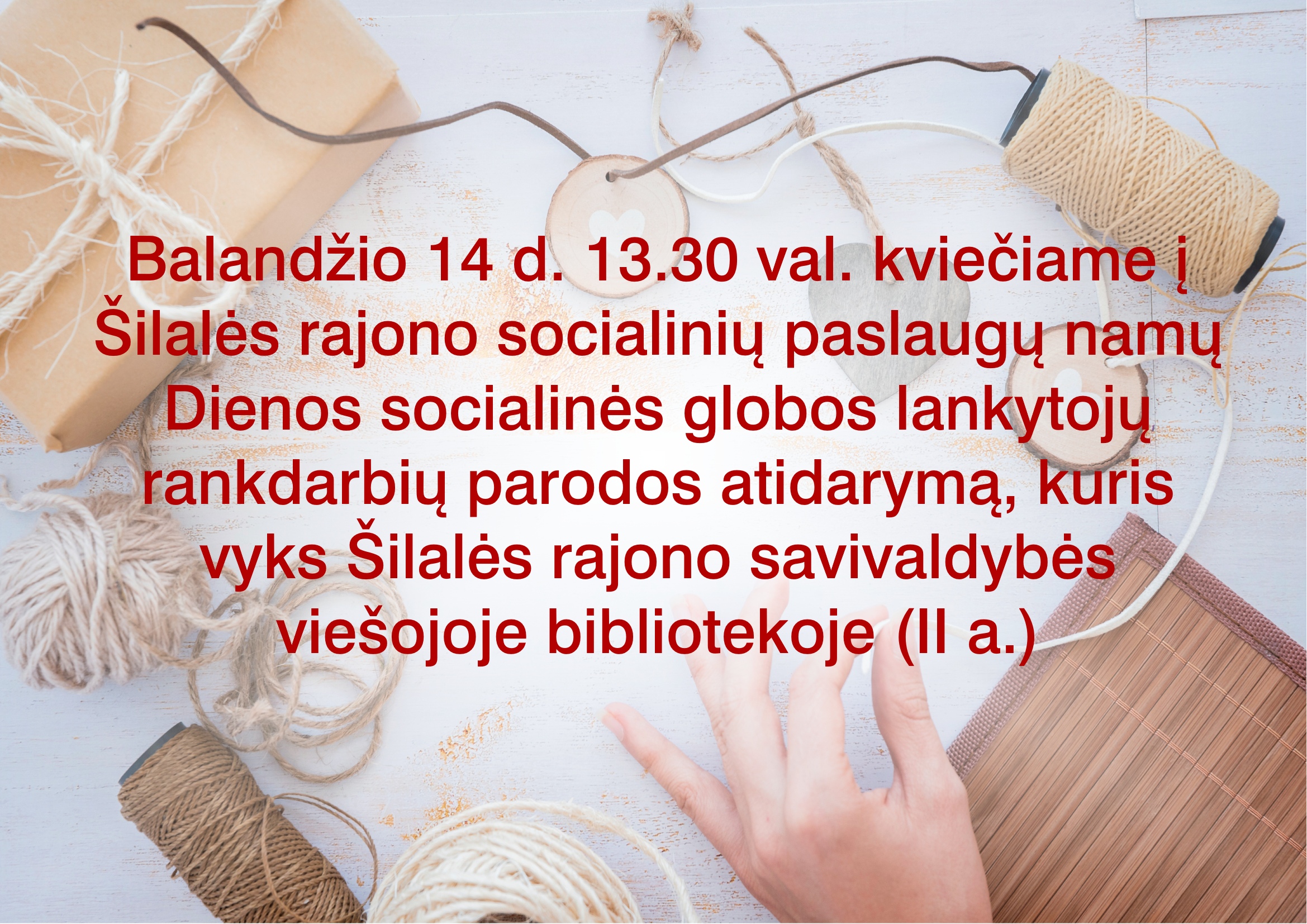 Balandžio 14 d. 13.30 val. kviečiame į Šilalės rajono socialinių paslaugų namų Dienos socialinės globos lankytojų rankdarbių parodos atidarymą, kuris vyks Šilalės rajono savivaldybės viešojoje bibliotekoje (II a.)