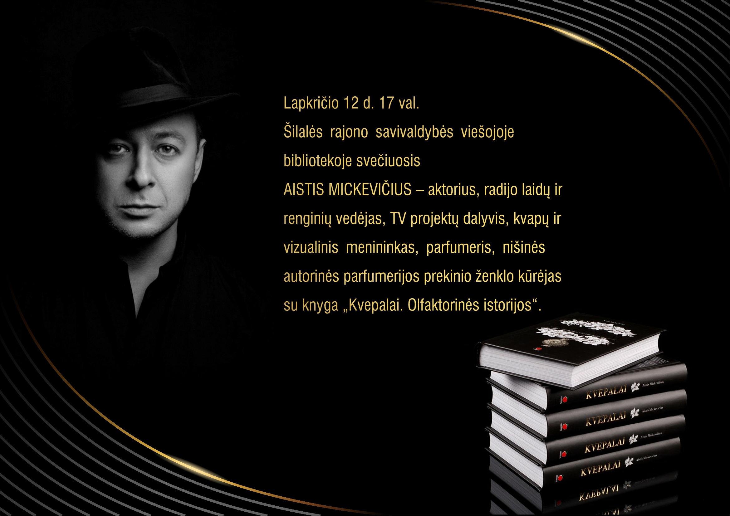 Lapkričio 12 d. 17 val. Šilalės rajono savivaldybės viešojoje bibliotekoje svečiuosis AISTIS MICKEVIČIUS – aktorius, radijo laidų ir renginių vedėjas, TV projektų dalyvis, kvapų ir vizualinis menininkas, parfumeris, nišinės autorinės parfumerijos prekinio ženklo kūrėjas su knyga „Kvepalai. Olfaktorinės istorijos“.