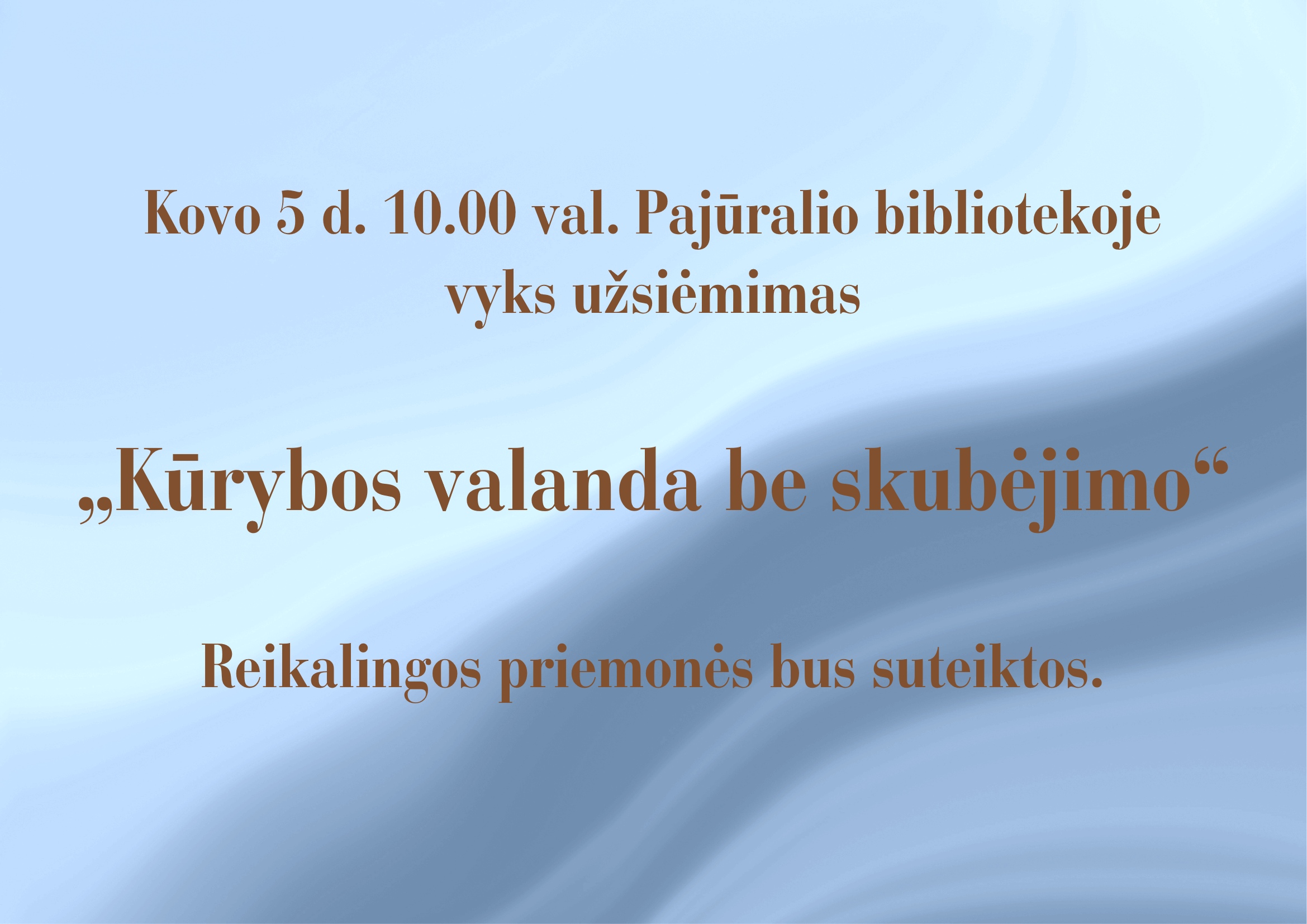 Kovo 5 d. 10.00 val. Pajūralio bibliotekoje vyks užsiėmimas „Kūrybos valanda be skubėjimo“.