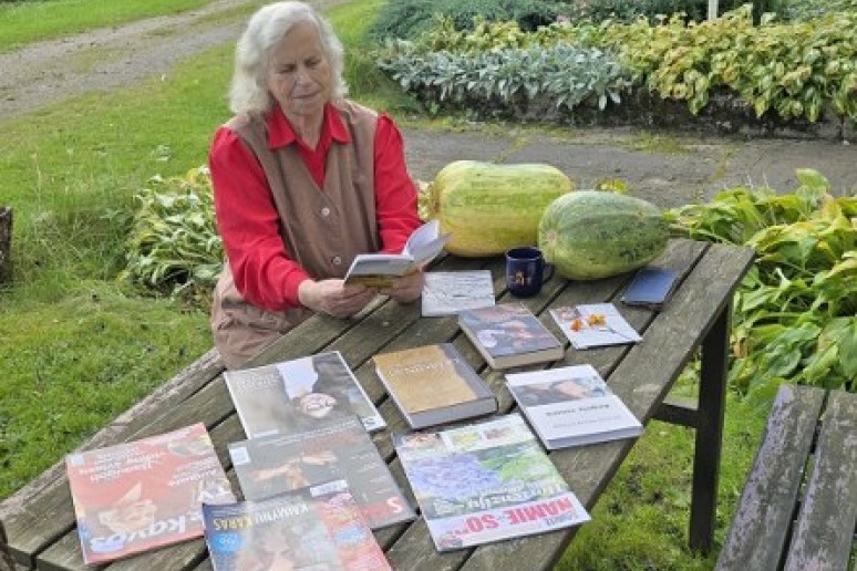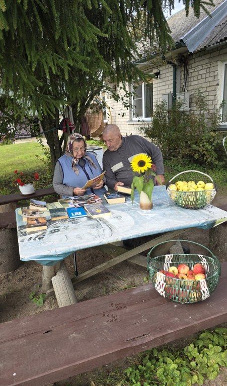 Gražiame vienkiemyje gyvena Ona ir Zenonas Tirūnai. Tik atvykus į jų sodybą, dėmesį patraukė ant lauko staliuko padėti krepšiai su obuoliais ir vazoje pamerkta saulėgrąža. Kadangi šilta, kalbamės lauke. Pasirenka, ką norėtų perskaityti, palieku knygų ir žurnalų.