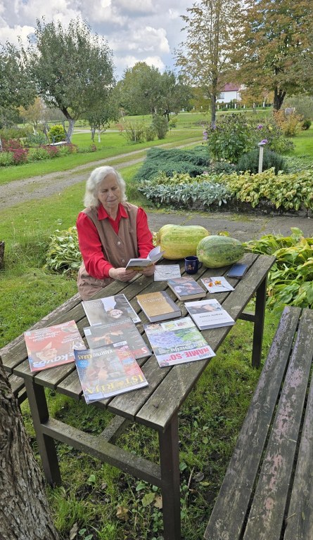 Ateinu pas mokytoją Eugeniją Taurosevičienę. Lauko stalelis apdėtas moliūgais, kuriuos ketina padovanoti kitiems. Laukia svečių. Susėdam, kalbamės apie knygas, kas jai labai patinka, žiūri, kokias knygas atnešiau. Pro šalį praeina jos sūnus Darius ir juokiasi: „Tu nepalik jai knygų, o tai naktimis skaitys“.