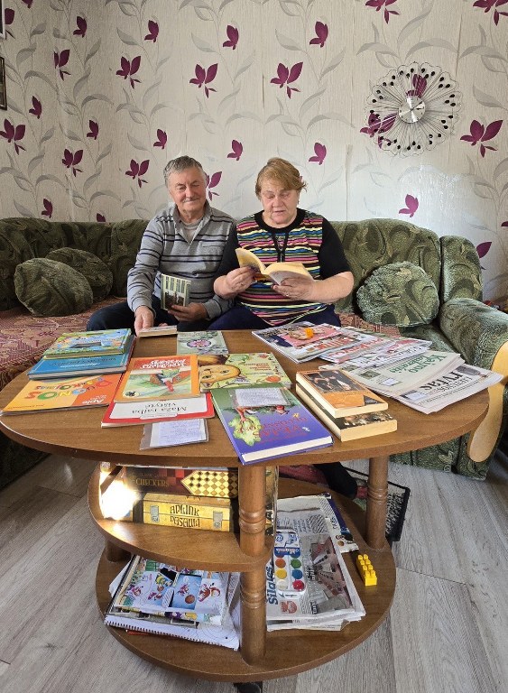 Seneliai Genė ir Juozas Zakarai, užauginę gausią šeimyną. Tad ir dabar jų namuose visada klega anūkėliai: nuo mažylių iki pat studentų. O čia knygos jau ne vien tik seneliams. Čia ir anūkai pavarto knygutes, tad į šiuos namus keliauja pati įvairiausia literatūra: nuo skirtos tik mažyliams iki seneliams apie medų, sodą ir porą lengvų romanų.