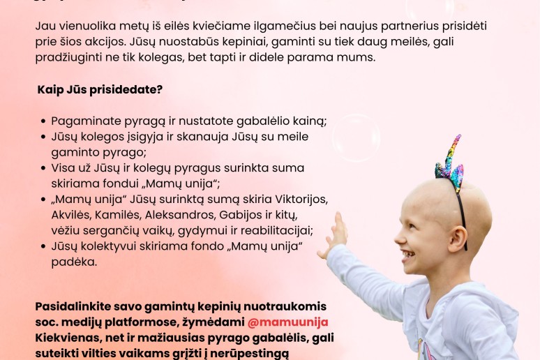 Pasidalinkite savo gamintų kepinių nuotraukomis soc. medijų platformose, žymėdami @mamuunija Kiekvienas, net ir mažiausias pyrago gabalėlis, gali suteikti vilties vaikams grįžti į nerūpestingą vaikystę!