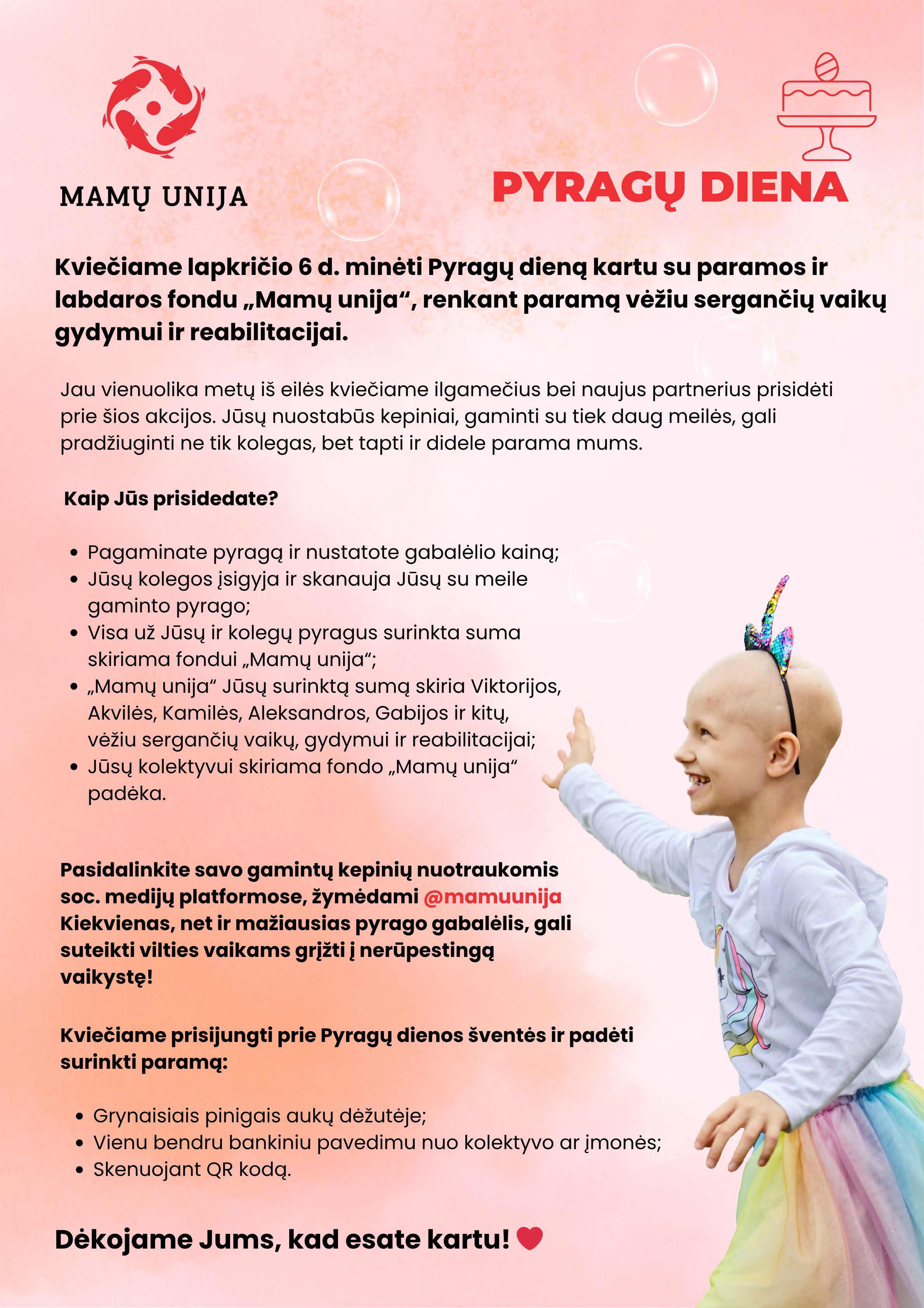 Kviečiame lapkričio 6 d. minėti Pyragų dieną kartu su paramos ir labdaros fondu „Mamų unija", renkant paramą vėžiu sergančių vaikų gydymui ir reabilitacijai.