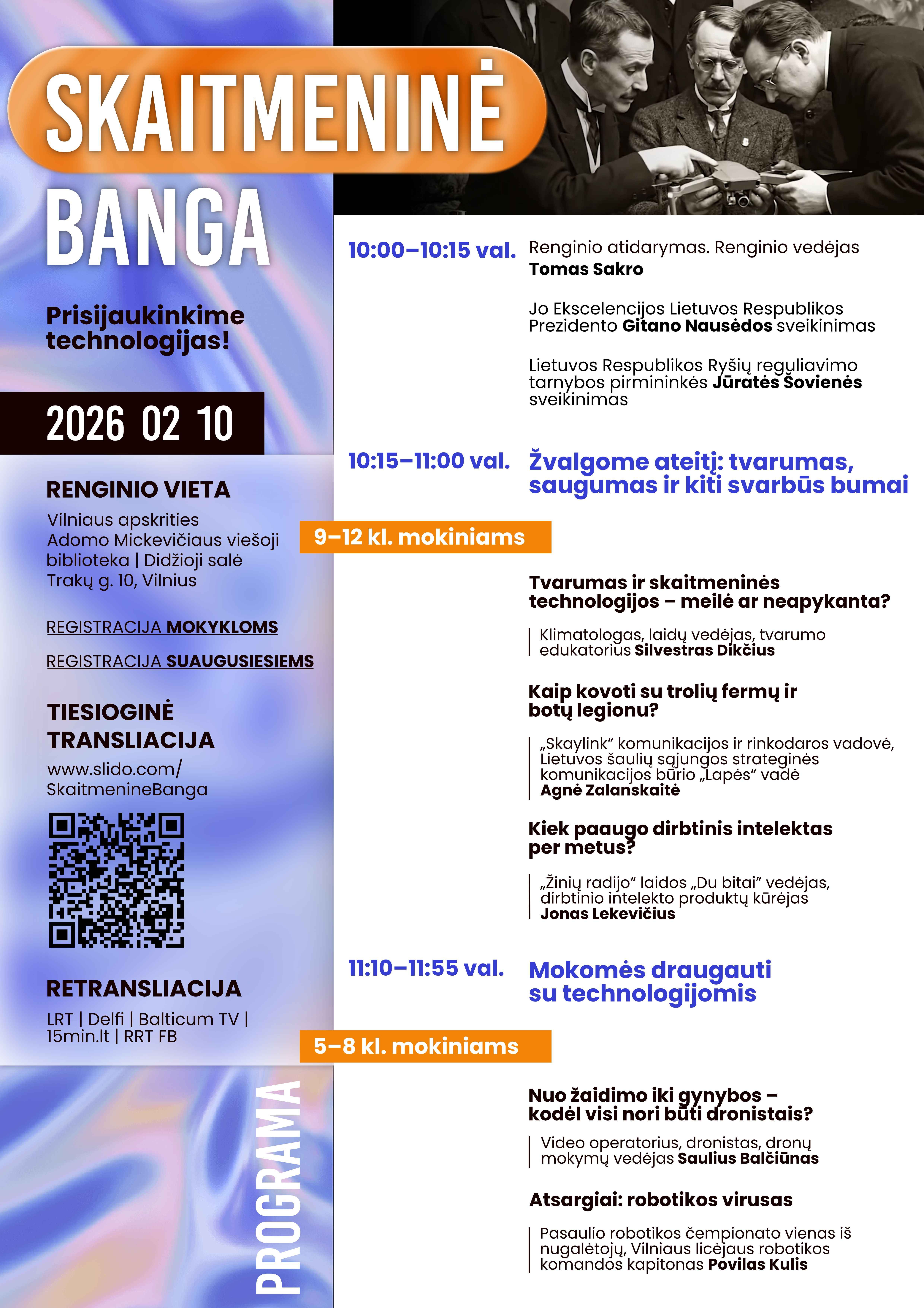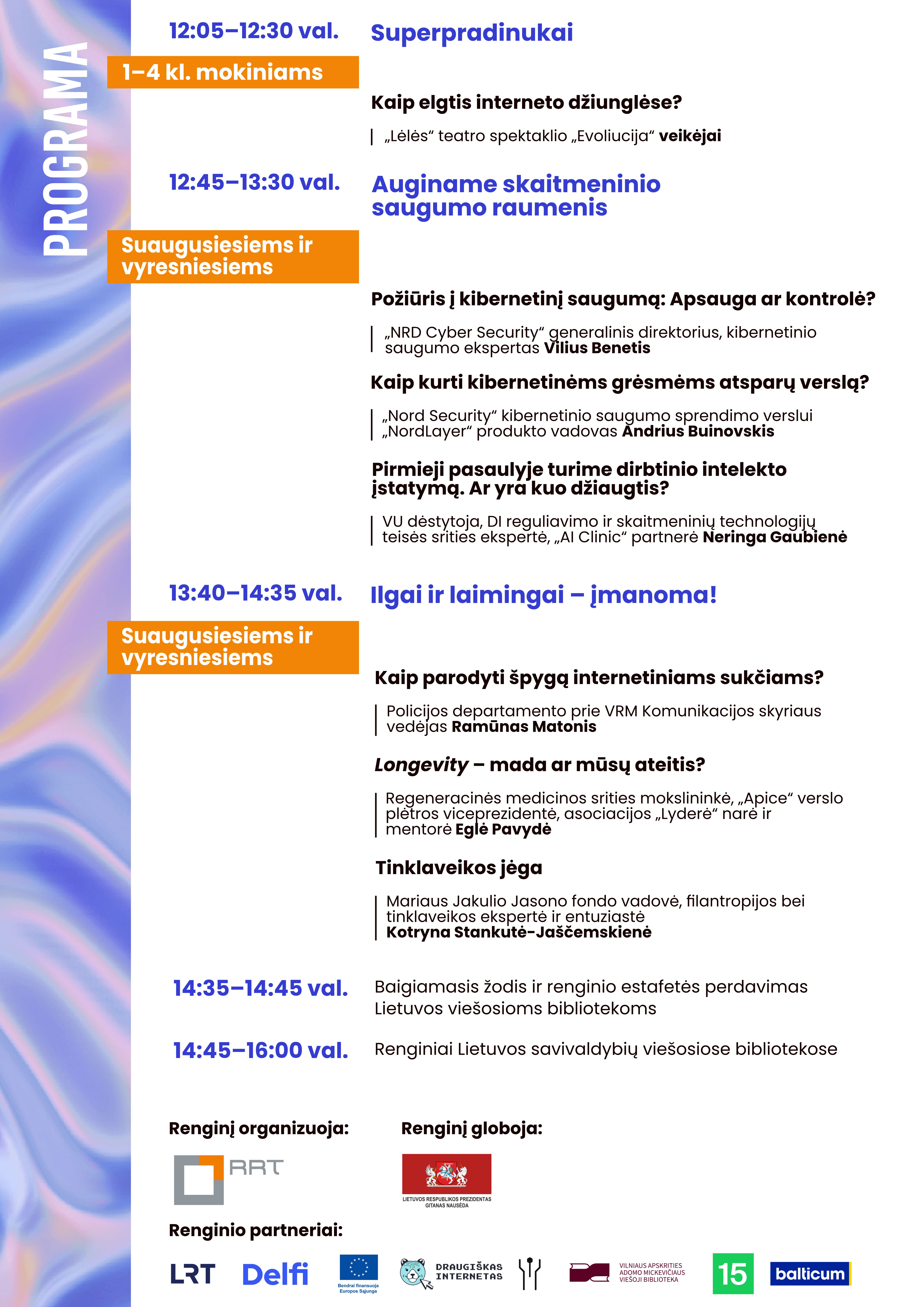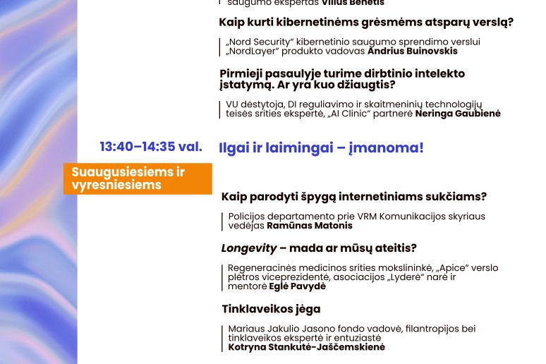 Renginio metu sužinokite, kaip būti atsparesniems melagienoms, internetiniams sukčiams, kaip atpažinti trolių ir botų pasisakymus, kaip valdyti dronus, kaip per metus patobulėjo dirbtinio intelekto įrankiai, kaip juos įvaldyti, su jais kurti ir kaip šį technologijų pasaulį suderinti su tvarumu, nepamiršti savęs ir pasirūpinti savo sveikata, kad gyventume ilgai bei laimingai.