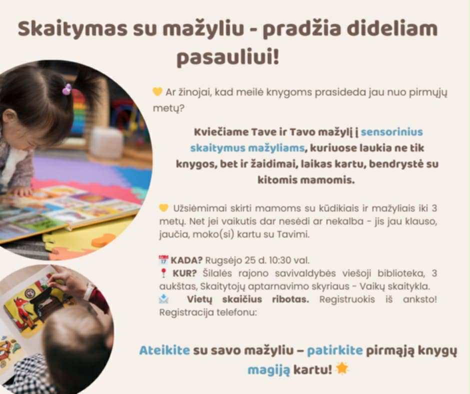 Ar žinojai, kad meilė knygoms prasideda jau nuo pirmųjų metų? Kviečiame Tave ir Tavo mažylį į sensorinius skaitymus mažyliams, kuriuose laukia ne tik knygos, bet ir žaidimai, laikas kartu, bendrystė su kitomis mamomis. Užsiėmimai skirti mamoms su kūdikiais ir mažyliais iki 3 metų. Net jei vaikutis dar nesėdi ar nekalba - jis jau klauso, jaučia, moko(si) kartu su Tavimi.