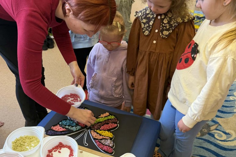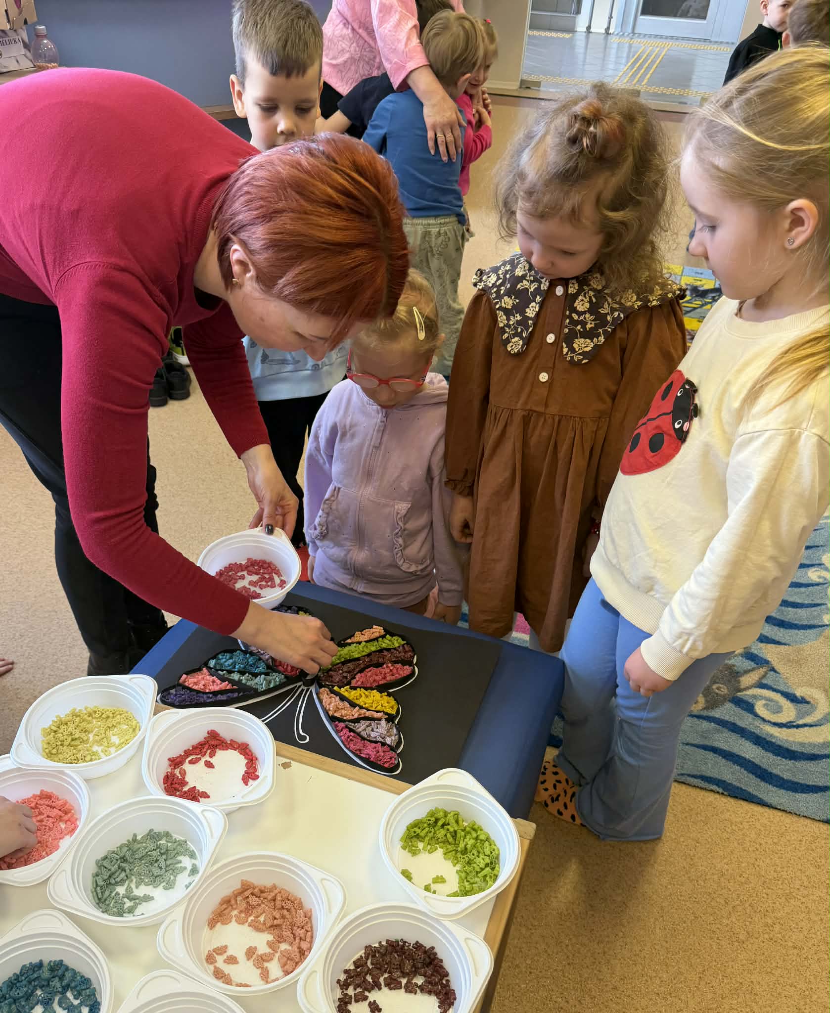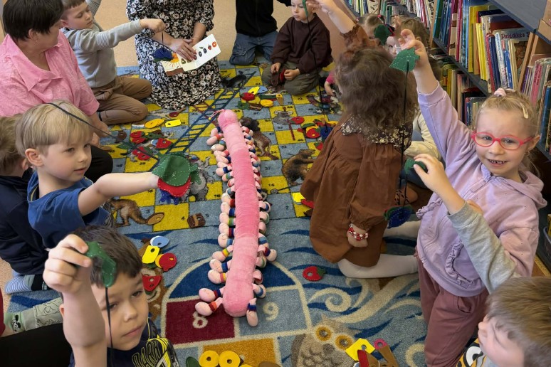 Edukacijos metu vaikai susipažino su gamtos ciklu – kaip iš mažo kiaušinėlio išsirita vikšrelis, kuris vėliau virsta gražiu drugeliu. Mažieji ne tik klausėsi istorijos, bet ir aktyviai įsitraukė – savo rankomis „vėrė“ vikšrelio suvalgytus gardumynus, mokėsi skaičių bei savaitės dienų.