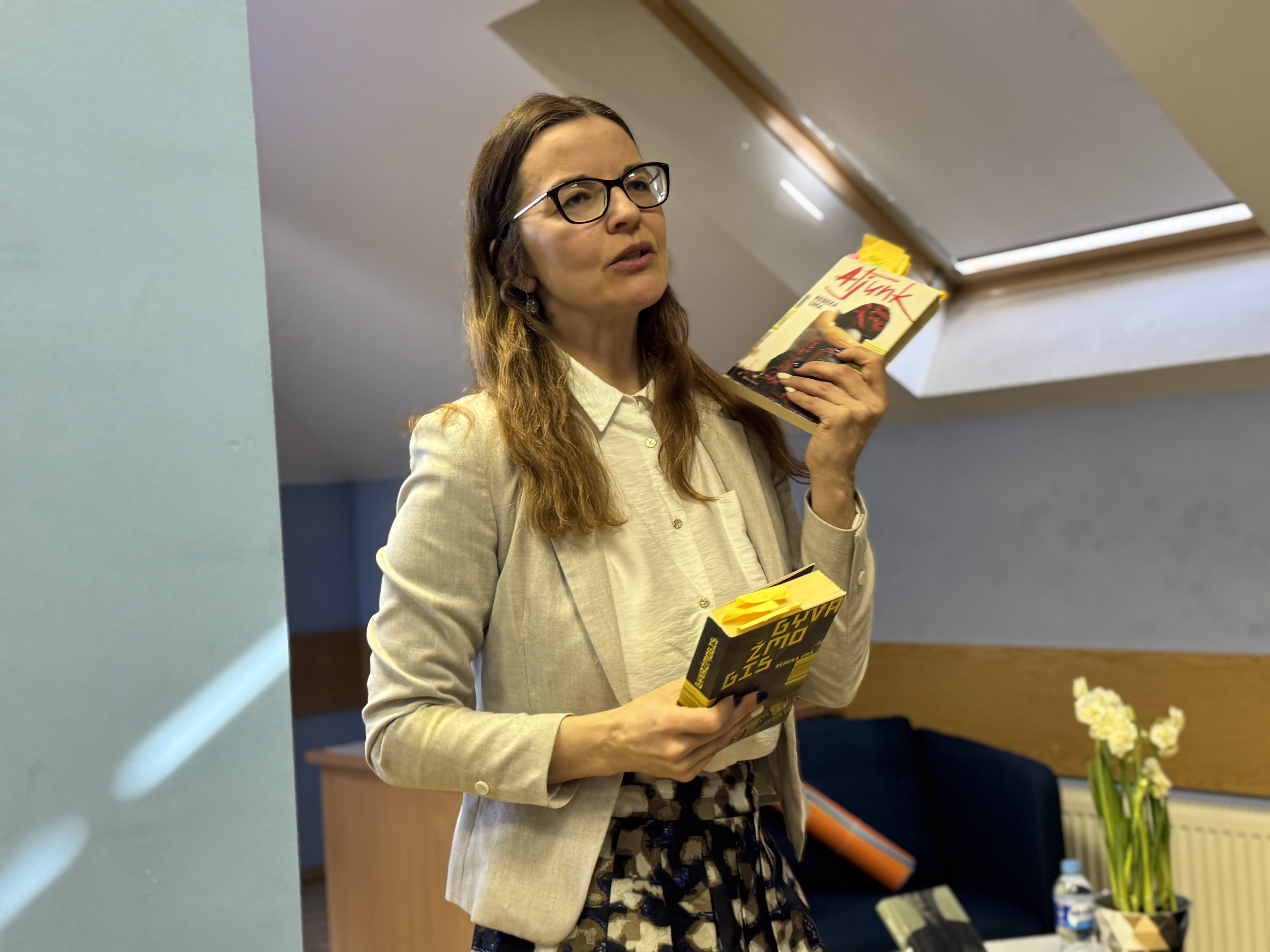 Susitikimo metu pristatytos knygos „Atjunk“ ir „Gyvažmogis“. Distopinis romanas „Atjunk“ pasakoja apie netolimą ateitį ir apie tai, kuo gali virsti žmogus sparčiai technologijų valdomame pasaulyje. 2015 metais ši knyga tapo leidyklos „Alma littera“ Paauglių ir jaunimo literatūros konkurso nominante, tais pačiais metais buvo išrinkta Metų knyga paaugliams ir apdovanota Prano Mašioto premija. Knyga „Gyvažmogis“ gali būti skaitoma kaip savarankiškas kūrinys arba kaip „Atjunk“ tęsinys. Tai įtraukiantis pasakojimas apie ateitį, kuri pradeda kurtis jau šiandien, kviečiantis diskutuoti apie technologijas ir žmogaus prigimtį.