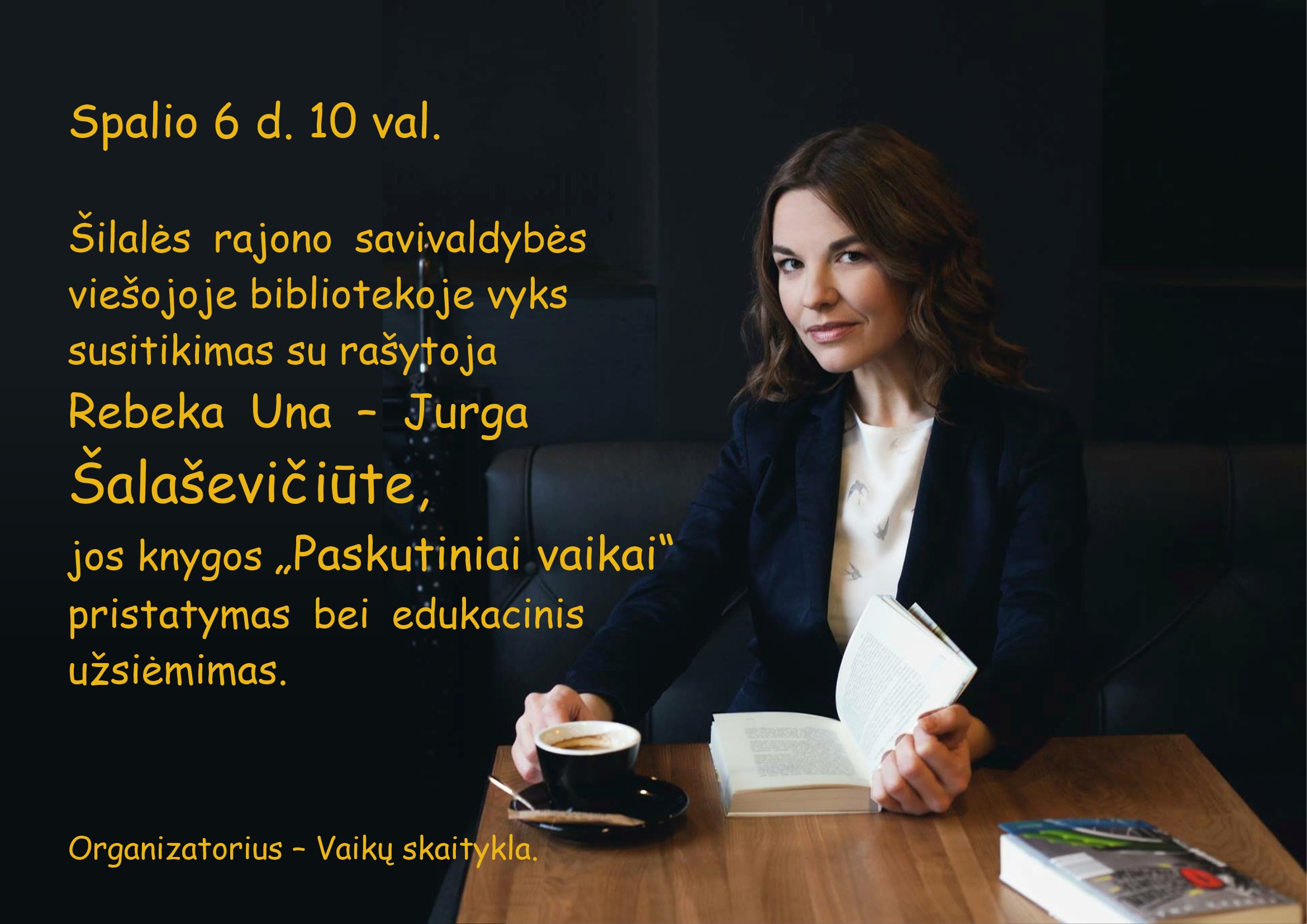 Spalio 6 d. 10 val. Šilalės rajono savivaldybės viešojoje bibliotekoje vyks susitikimas su rašytoja Rebeka Una – Jurga Šalaševičiūte, jos knygos „Paskutiniai vaikai“ pristatymas bei edukacinis užsiėmimas.