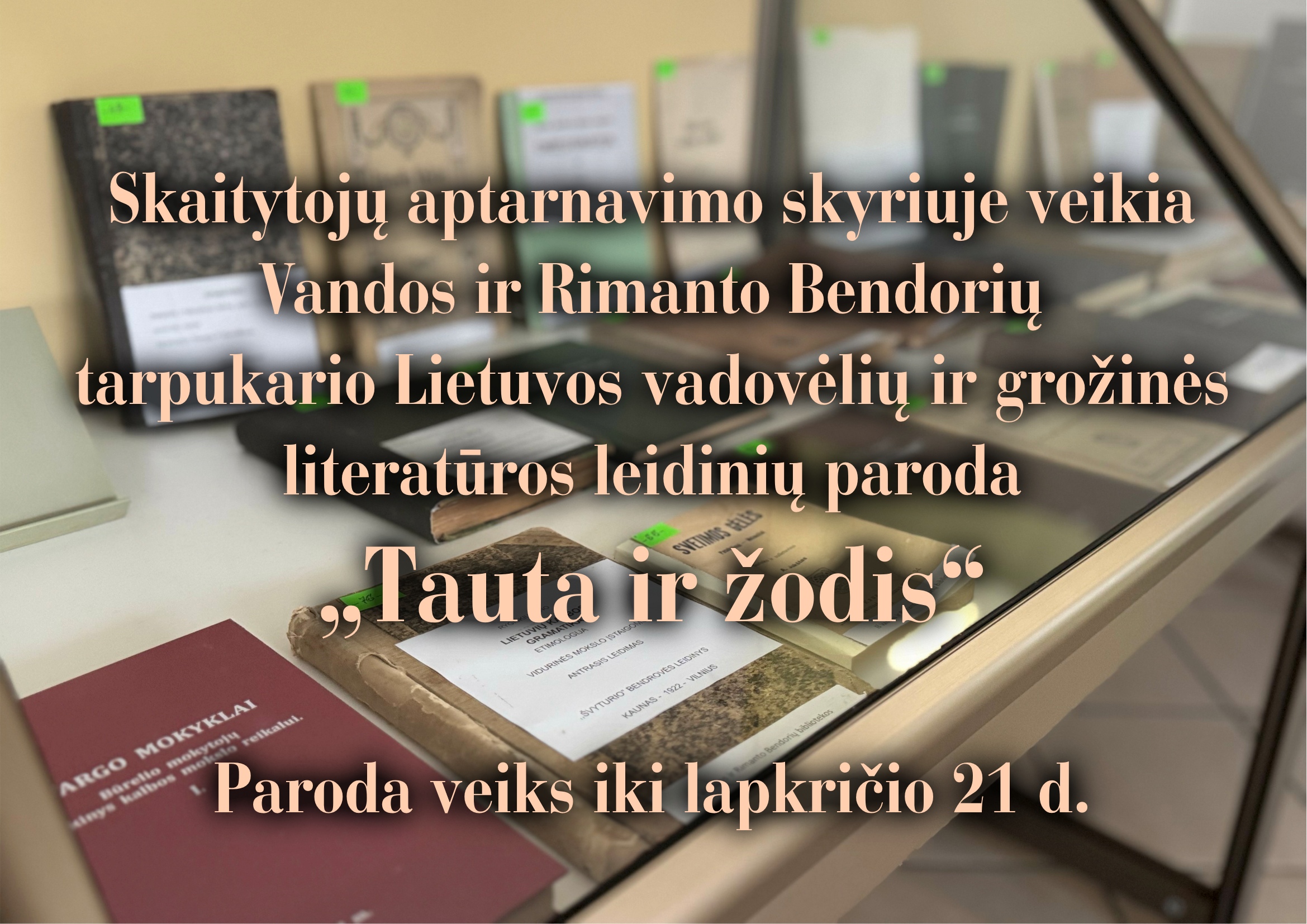 Skaitytojų aptarnavimo skyriuje veikia Vandos ir Rimanto Bendorių tarpukario Lietuvos vadovėlių ir grožinės literatūros leidinių paroda „Tauta ir žodis“.