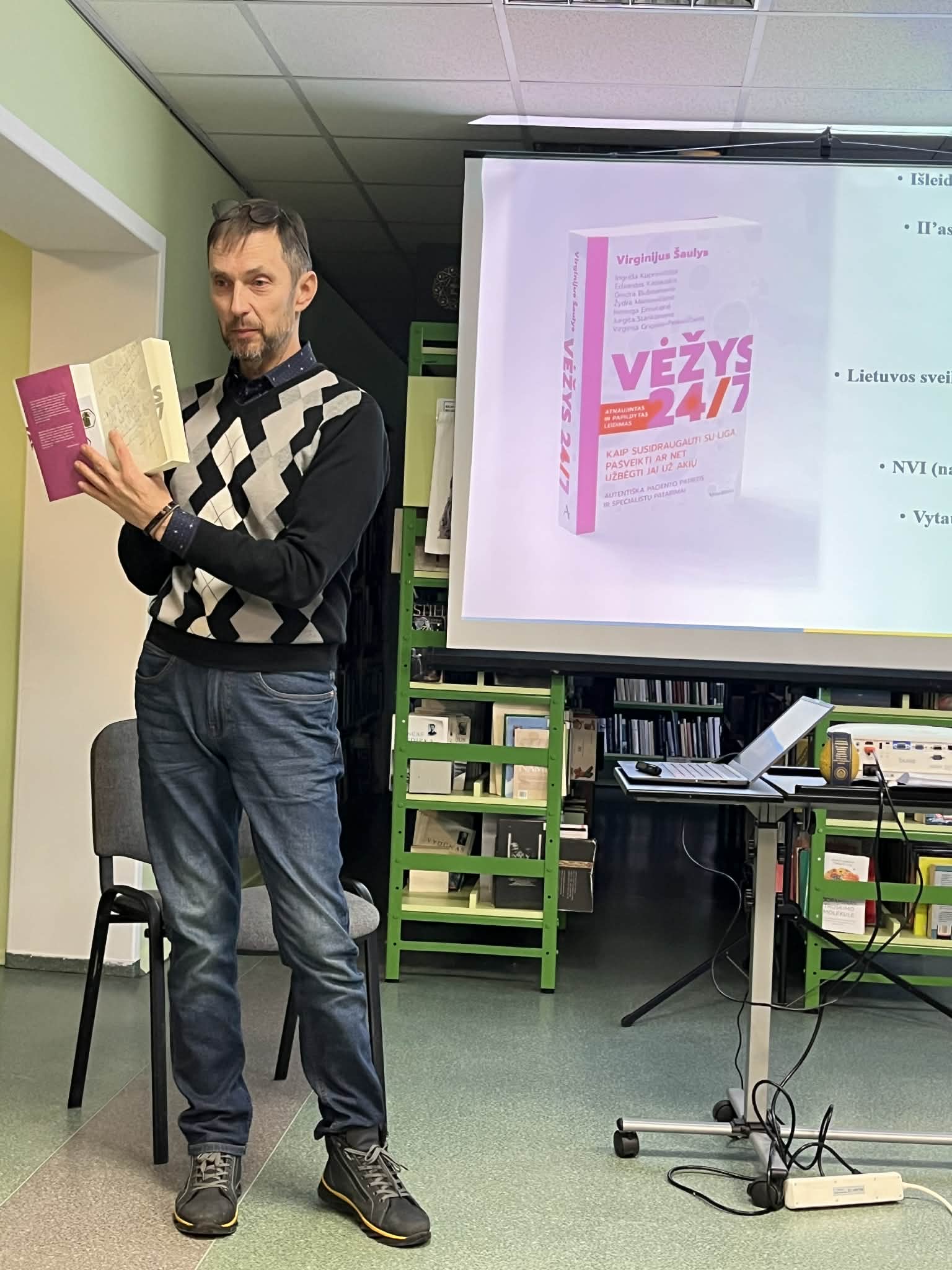 Skaitytojų aptarnavimo skyriuje susirinkusiems bibliotekos lankytojams autorius pristatė savo knygą ir atvirai pasidalijo asmenine sveikimo istorija. Susitikimo metu V. Šaulys kalbėjo apie svarbiausius aspektus kovoje su liga – požiūrį į save, mitybą, judėjimą, psichologinę savitvardą ir vidinę stiprybę. Jis nevengė kalbėti apie patirtą stresą ir pasimetimą, kurie apėmė išgirdus vėžio diagnozę, tačiau pabrėžė, kad nurimus emocijoms atėjo suvokimas – pirmiausia reikia pasveikti mintyse ir gyventi dėl žmonių, kuriuos myli.